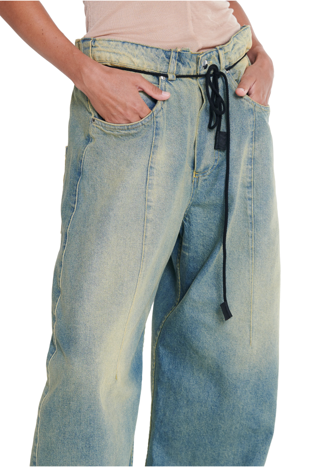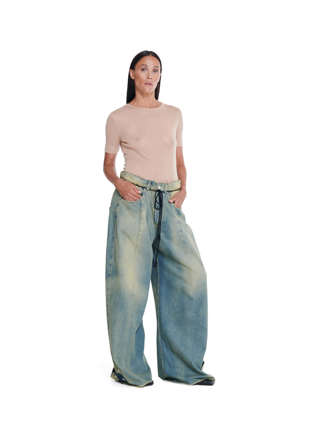Distressed baggy jeans are a true statement piece. With their carefully designed shape and buttoned tab at the hem, these pants effortlessly blend comfort and style, allowing you to adjust the silhouette according to your preference in multiple ways.