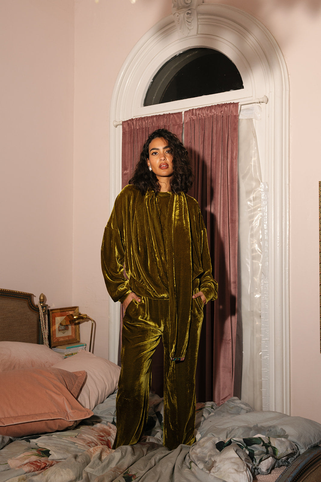 Velour wide trousers with an elegant sheen. Loose and easy to wear. Elasticated waistband. Pockets.