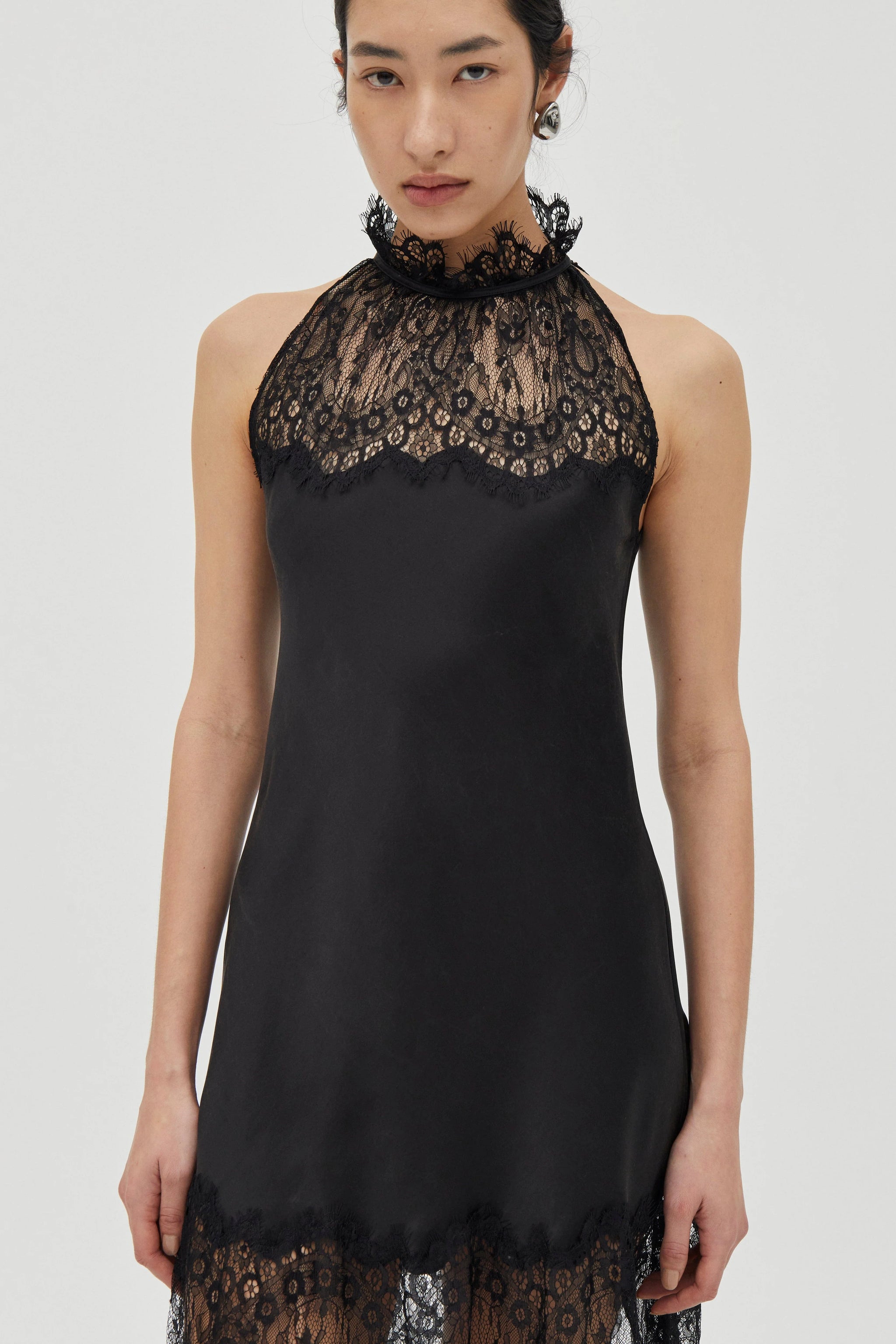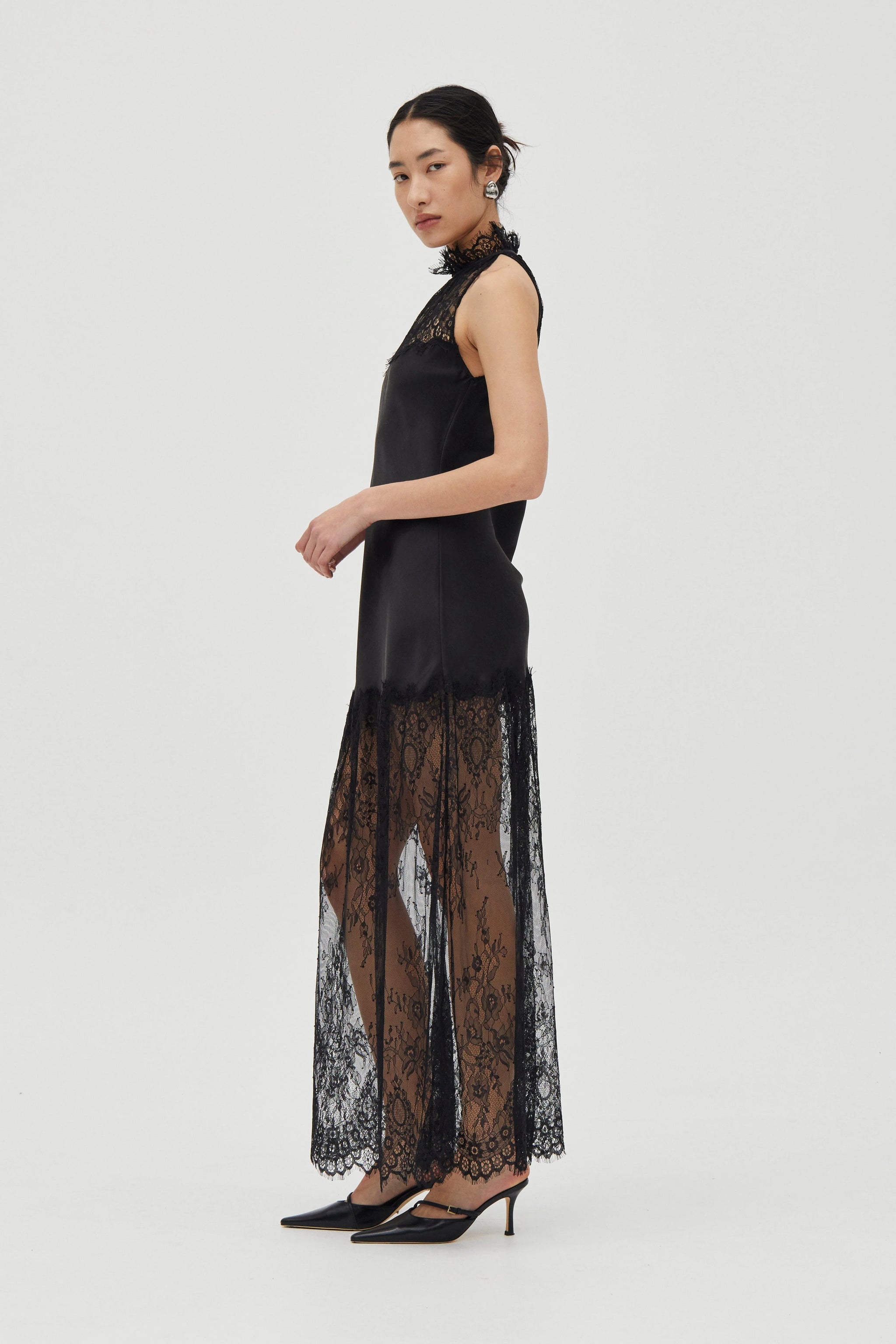 The Poetry Lace Drawn-In Maxi Dress is cut on the bias moving with natural ease. A gathered lace neckline with a soft frilled edge frames the décolletage, finished with a satin-bound neck and delicate back keyhole closure. Sheer lace extends through the skirt to a full maxi length, detailed with a scalloped edge for a considered finish.