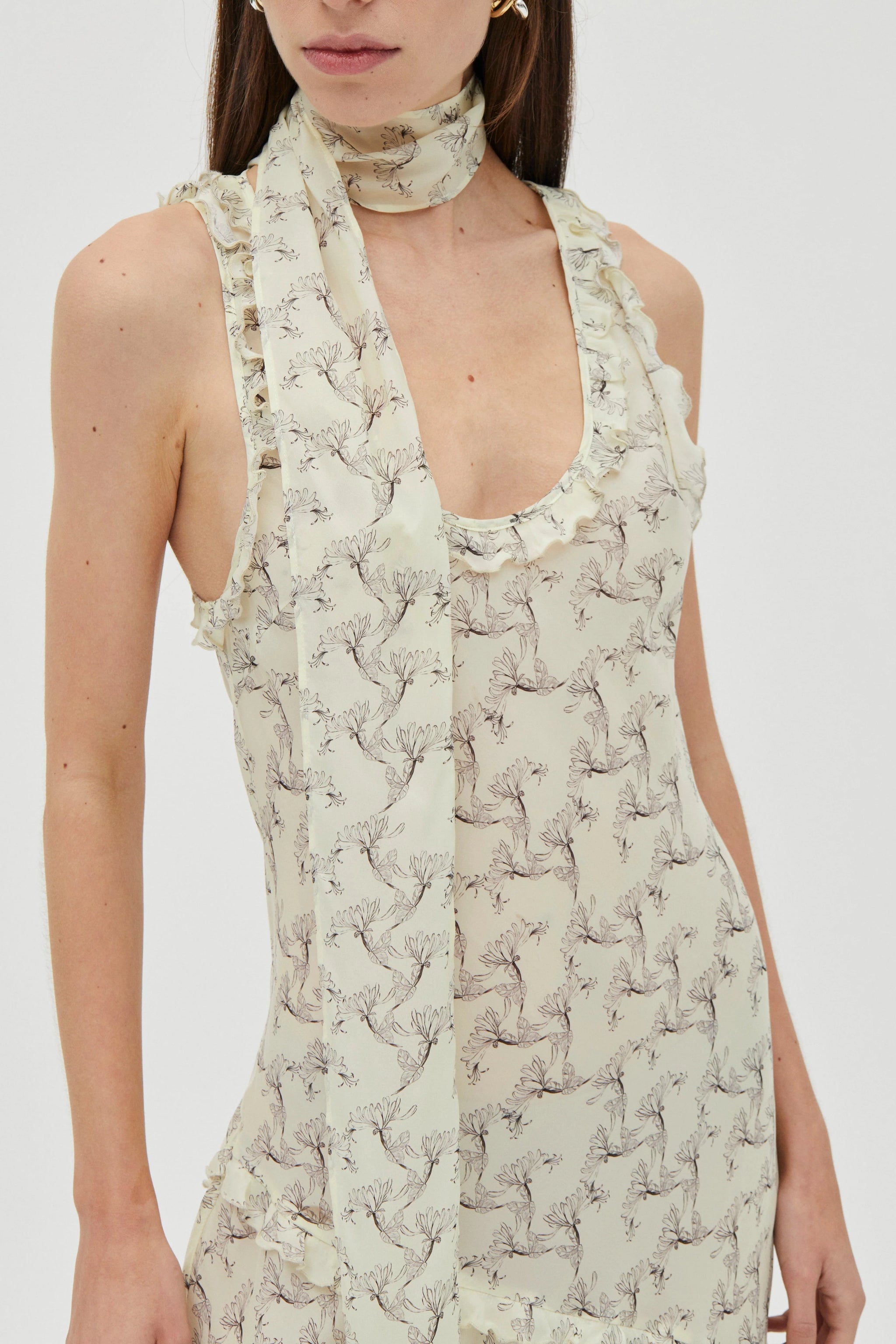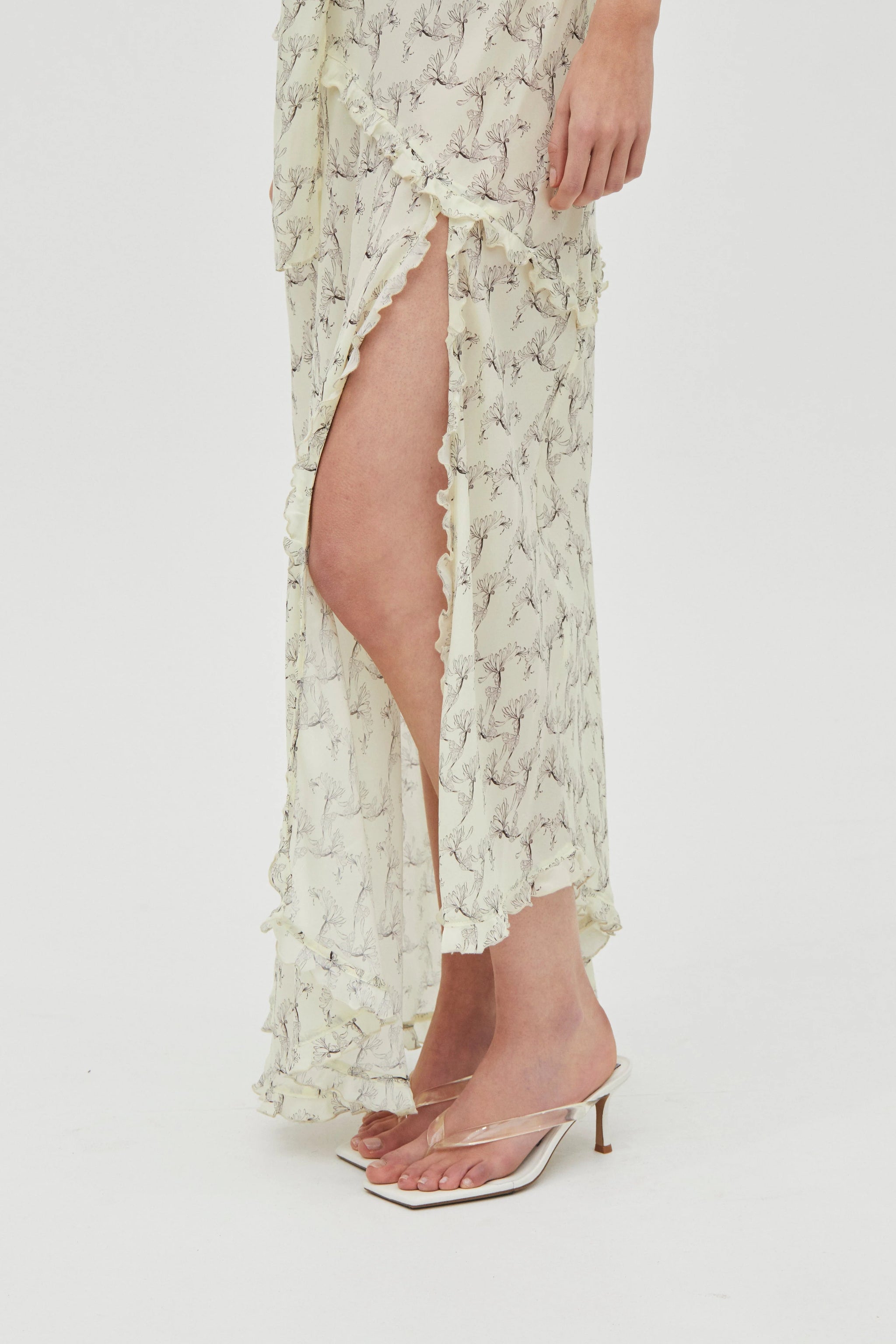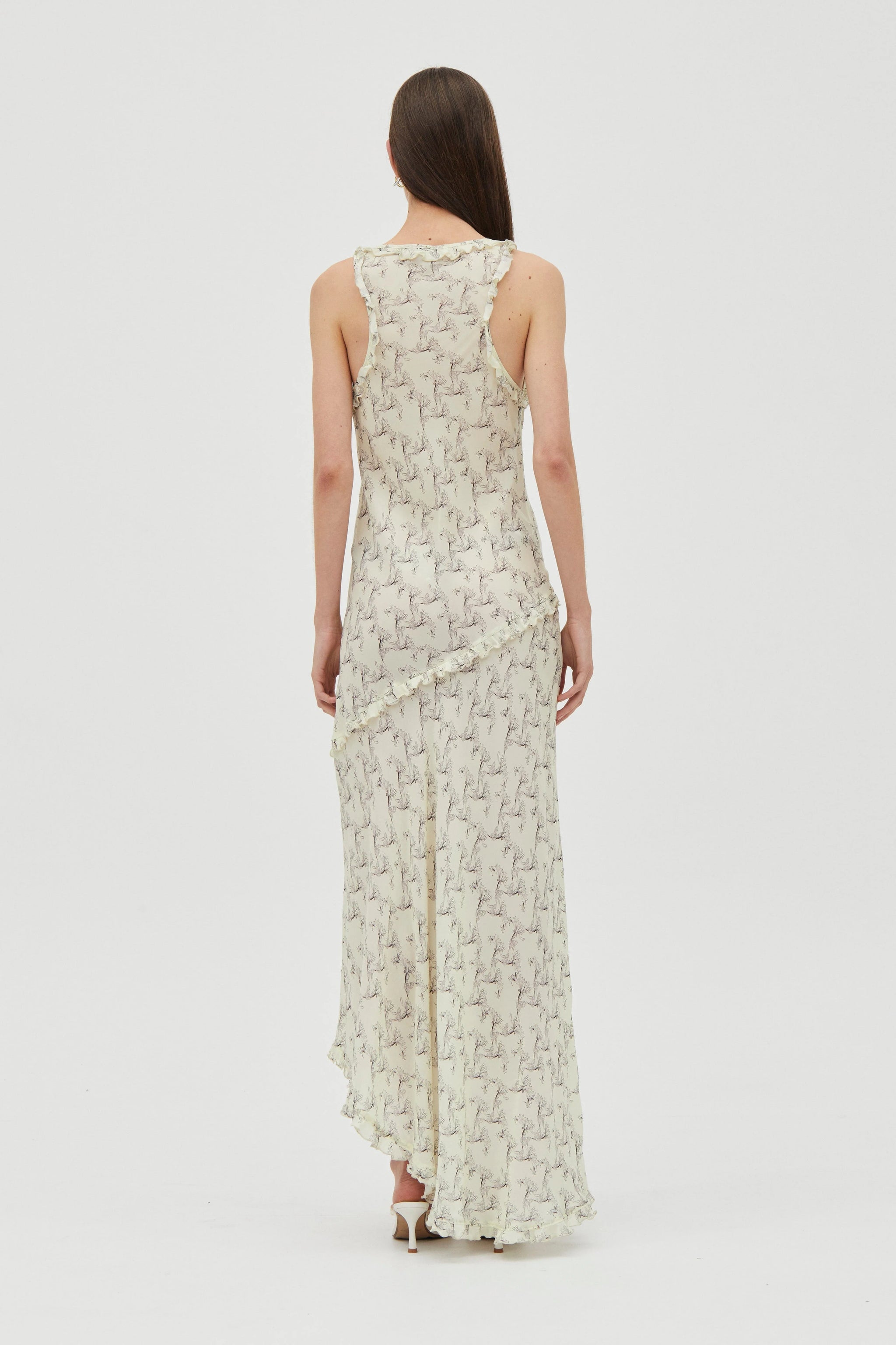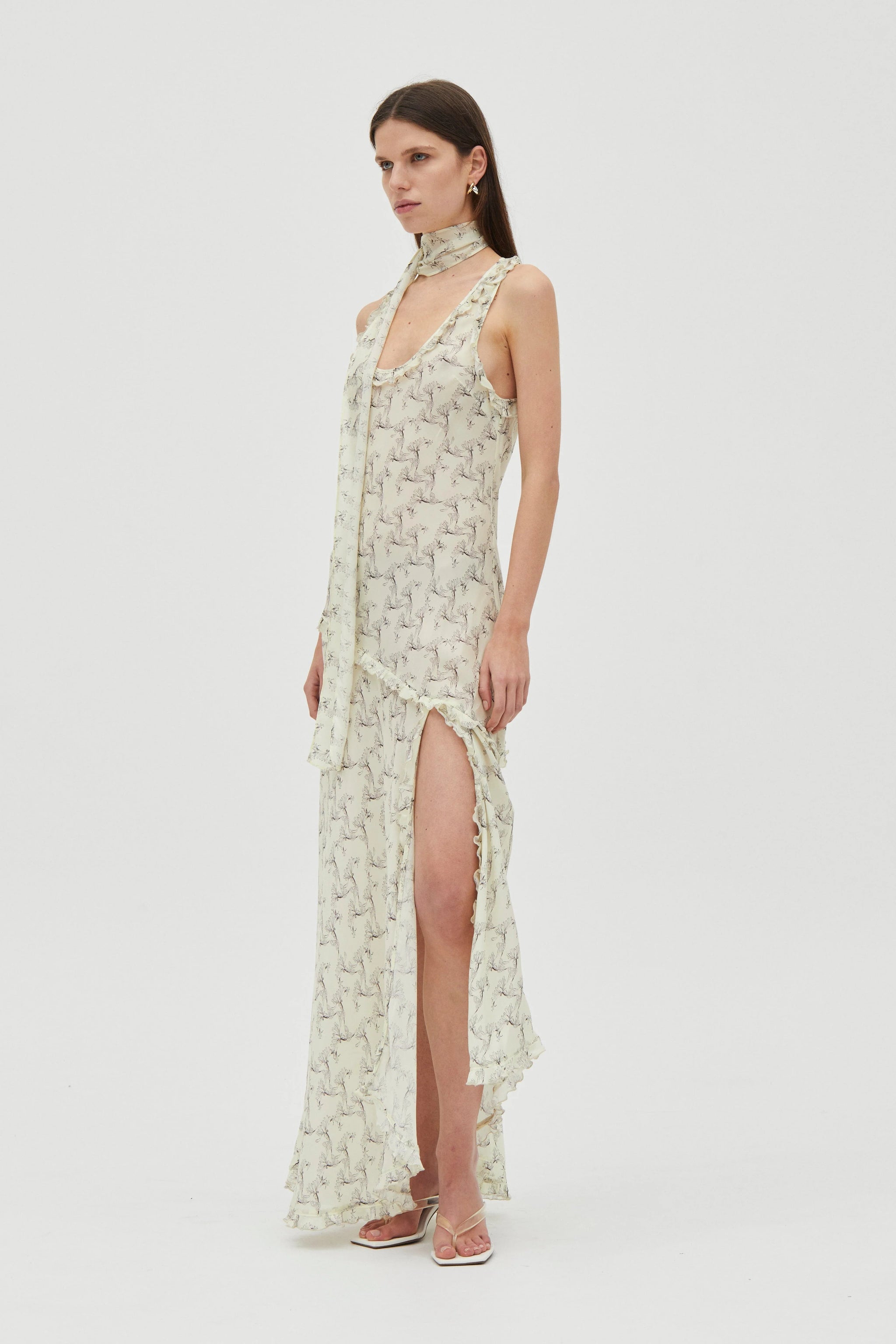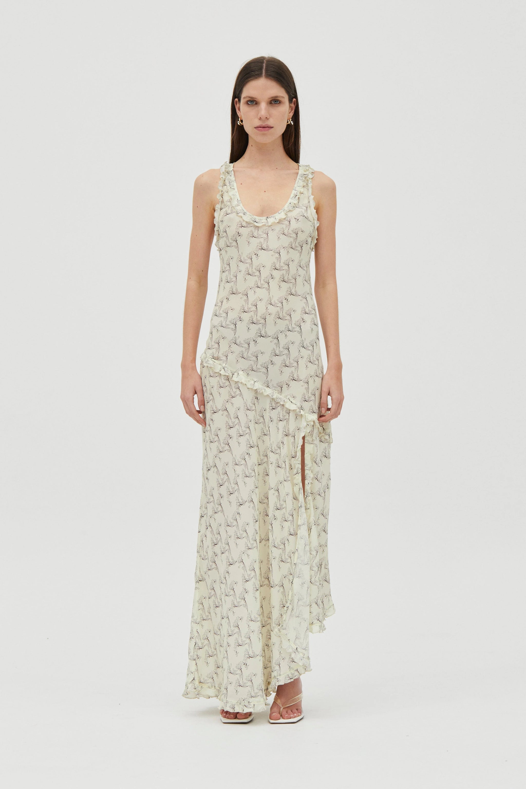 The Solace Frill Tank Maxi Dress is crafted in an exclusive THIRD FORM print and cut on the bias to softly skim the body. A scoop tank neckline, babylock-finished frilled edges and an asymmetric maxi hem with a left-leg split define the silhouette. Complete with a matching scarf.
