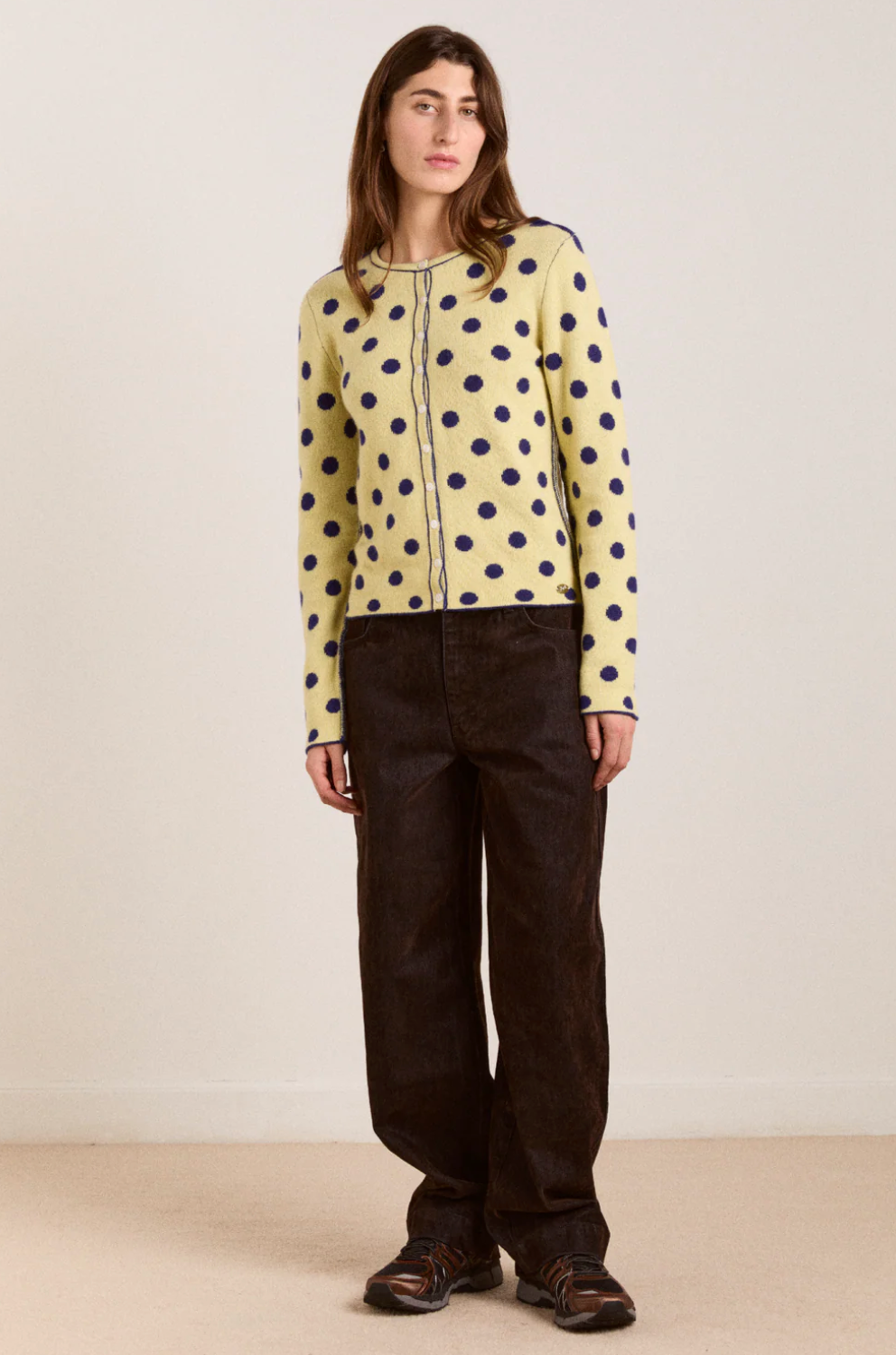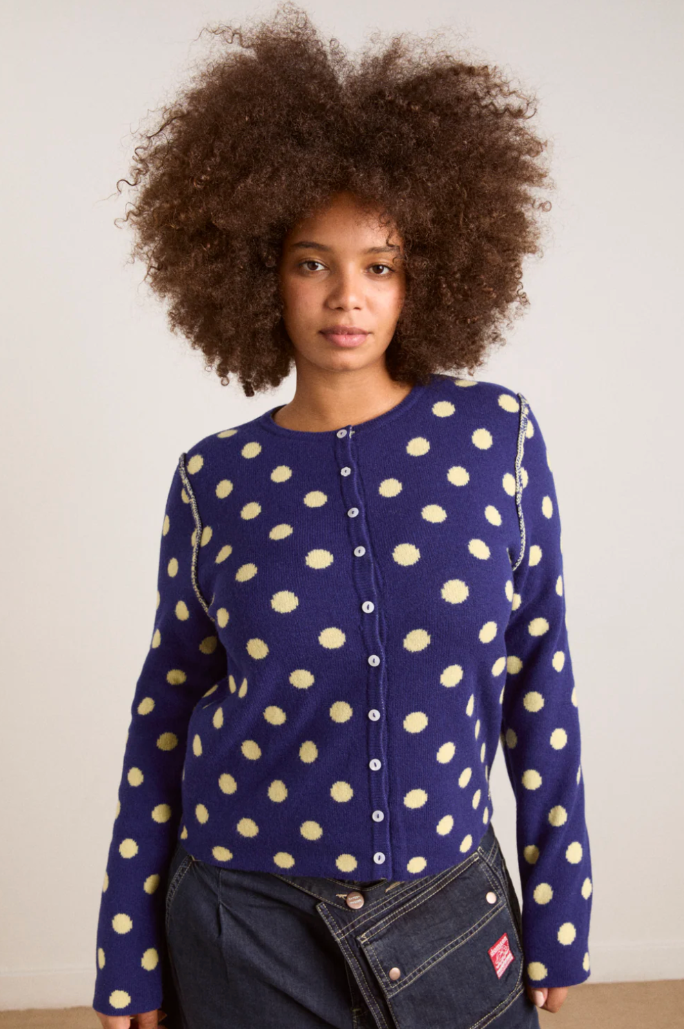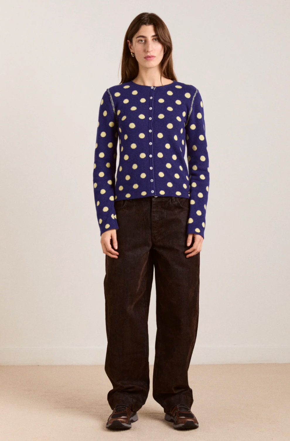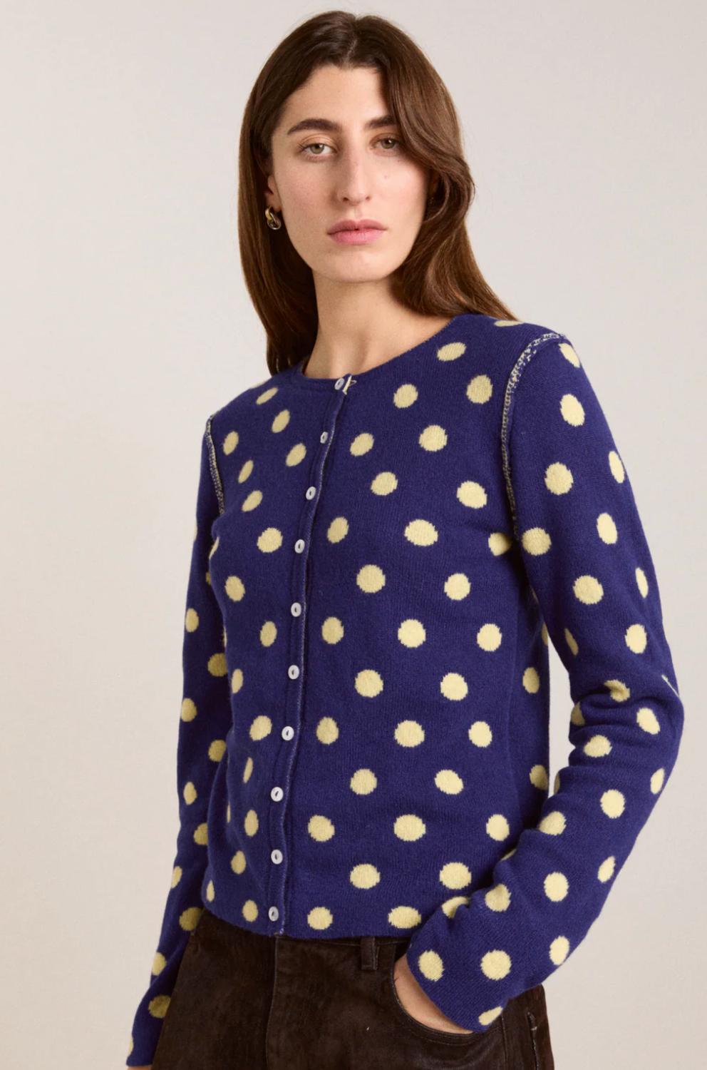 The Tabitha Merino Reversible Cardigan is crafted from 100% RWS Merino Wool and features an all-over spot design that’s made to be worn both ways. With its relaxed fit, crew neck, and classic button-d own front, it’s an easy wardrobe staple. Finished with a subtle metal DM branding tab for a refined touch.