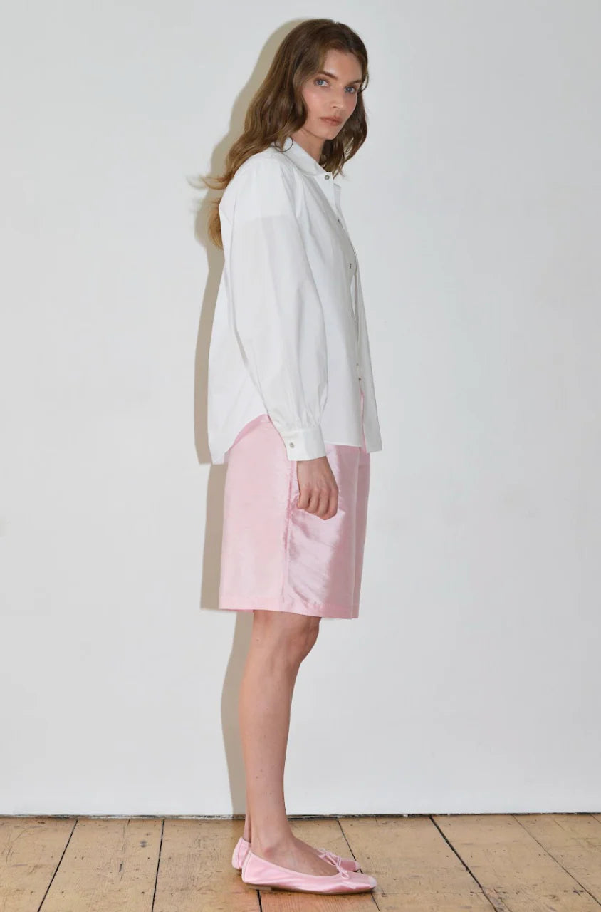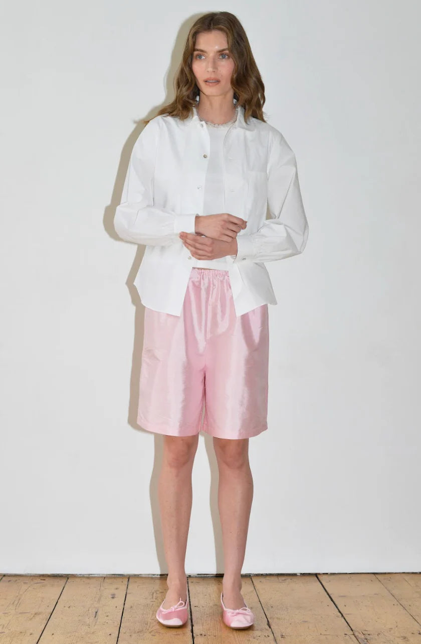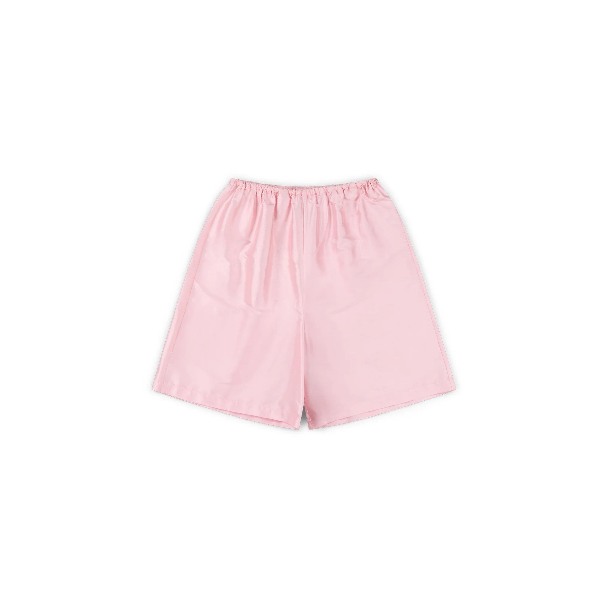 The Adeline Shorts in light pink are crafted from Dupion silk. They feature an elasticated waistband, and the legs are cut just above the knee.