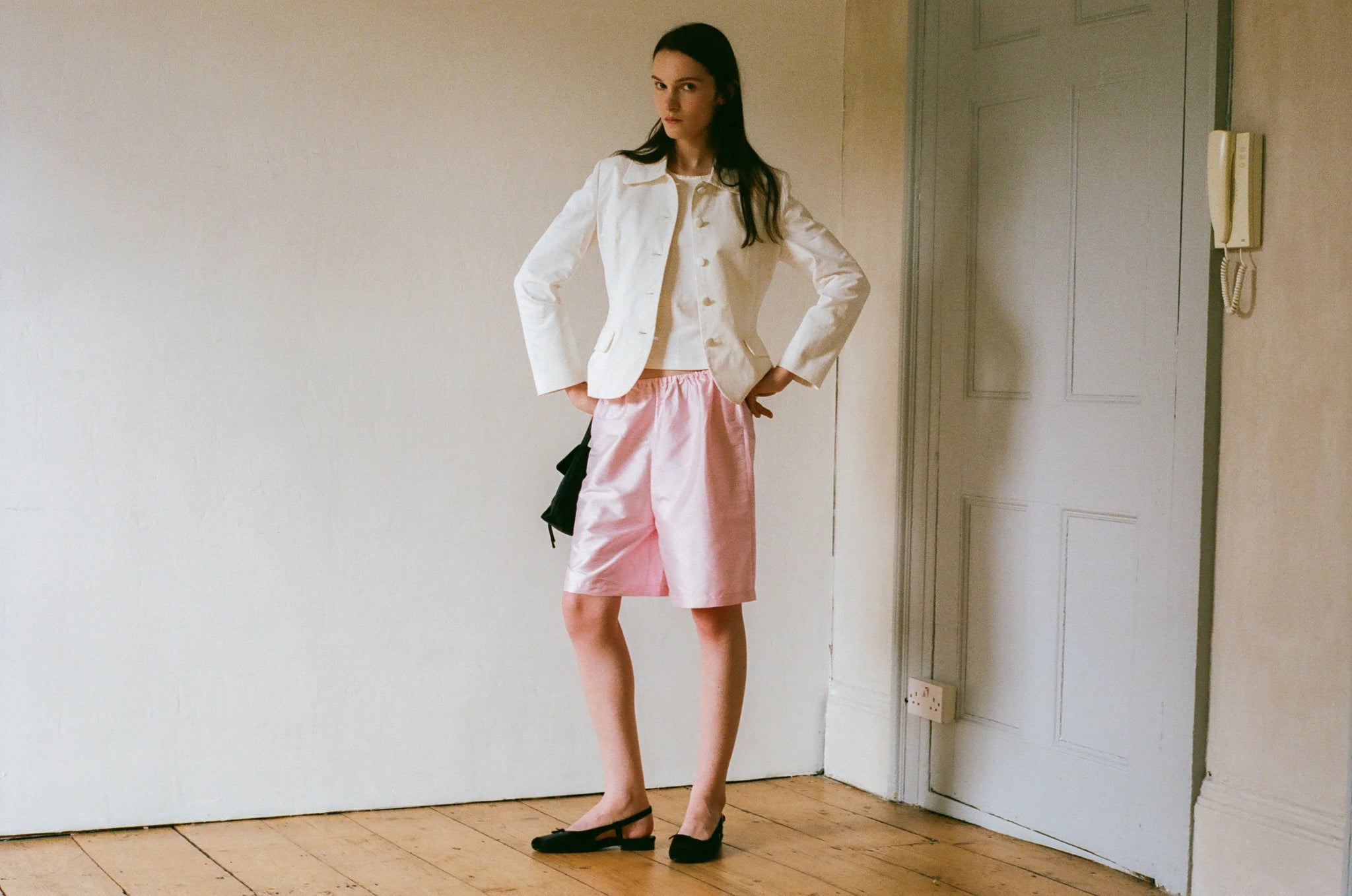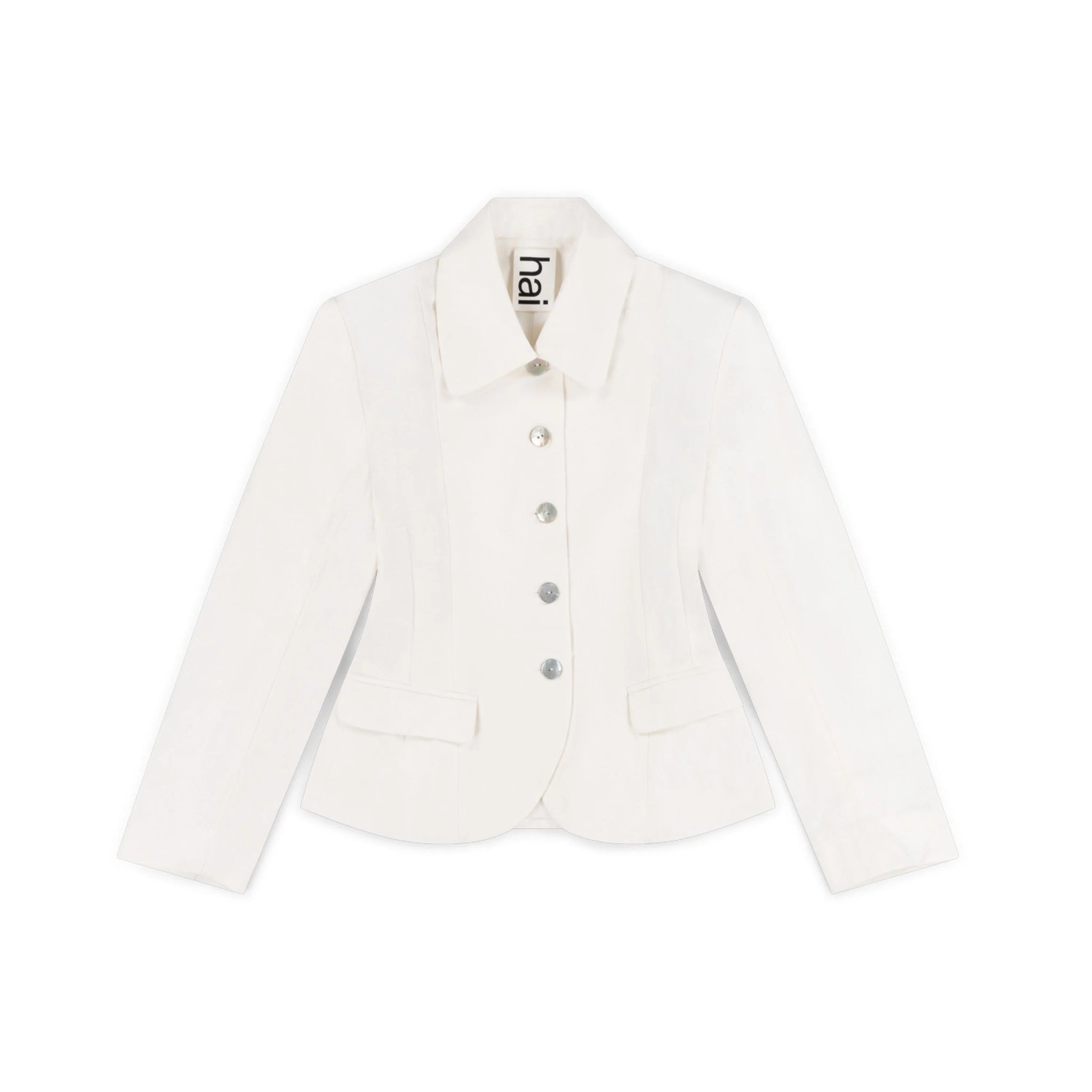 The Audrey Jacket in white is crafted from a soft cotton twill. A timeless silhouette with mother of pearl buttons.