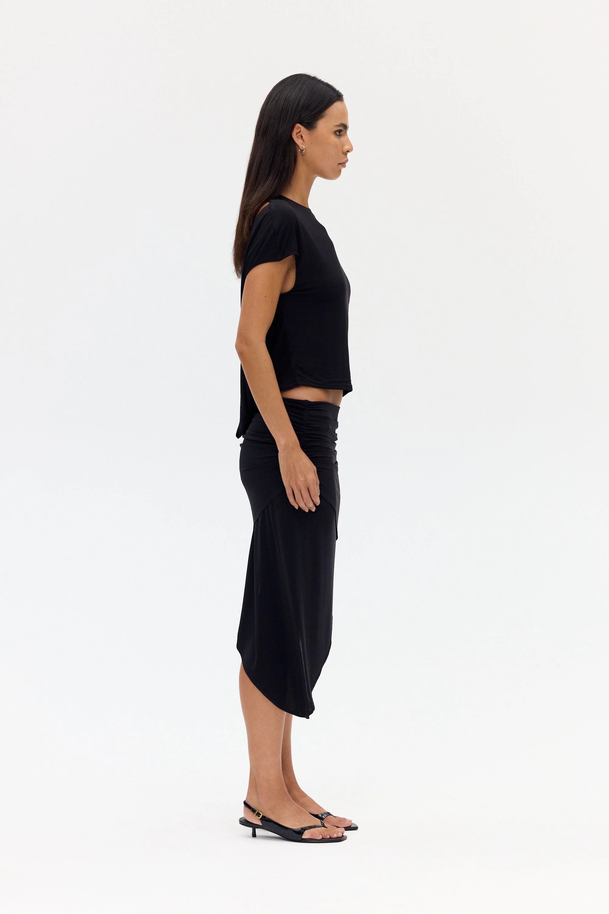 The Crave Drape Skirt is defined by its asymmetric lines and fluid draping. Cut to a slim fit, the dual-layered design is softly gathered at the sides to create dimension and ease. A concealed elasticated waistband allows for effortless wear, while the asymmetric hem brings a directional finish to this versatile piece.