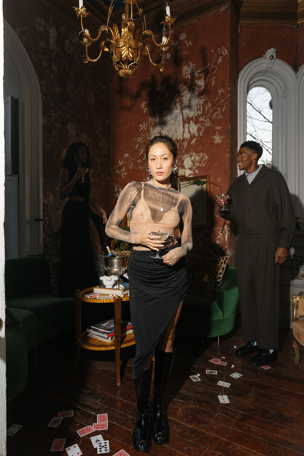 The top is sewn and spraypainted with vintage lingerie in our Paris atelier. This makes each print completely unique.