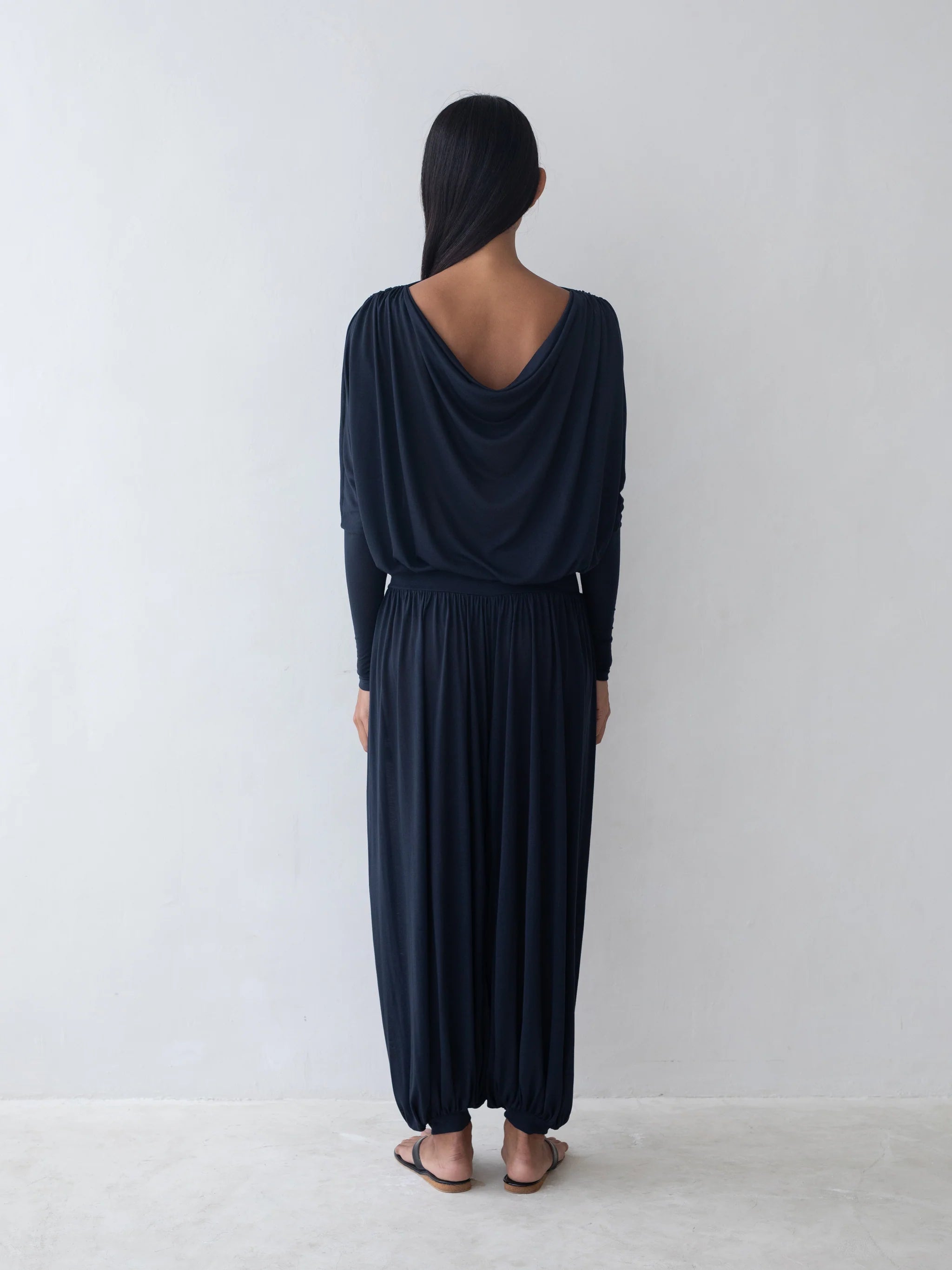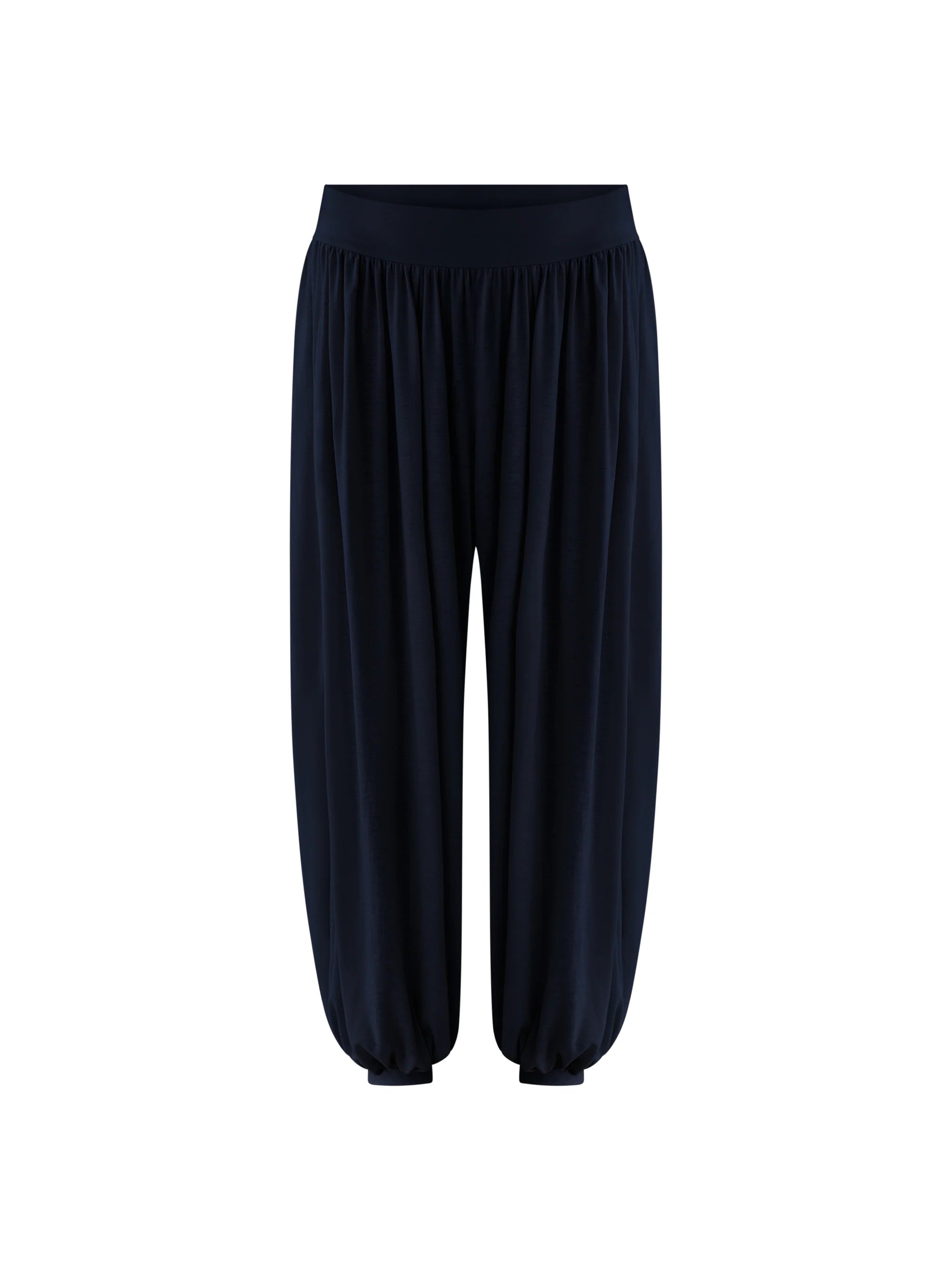 Relaxed draped pants with wide waistband, gathered pleating, and fitted cuffs.