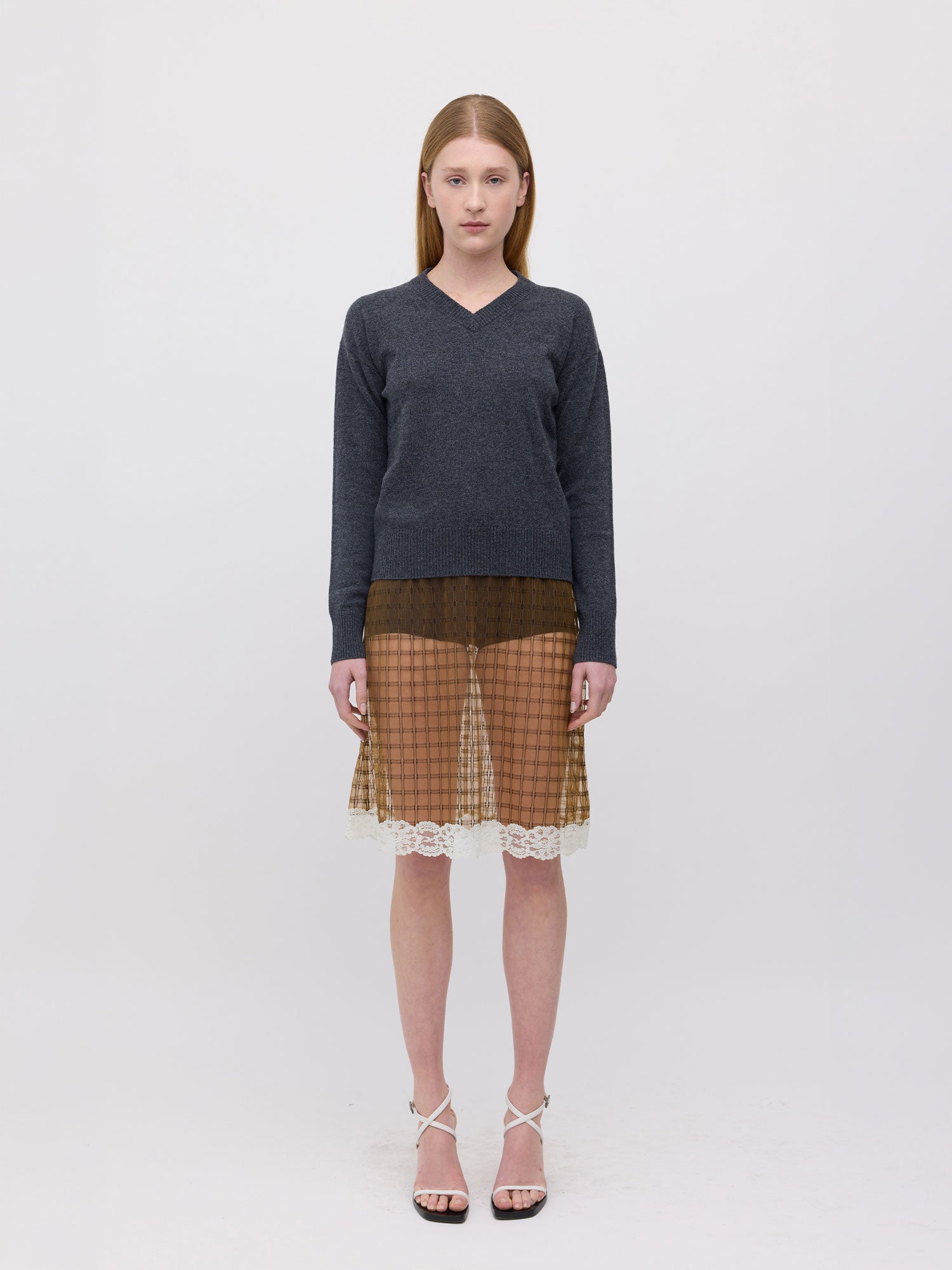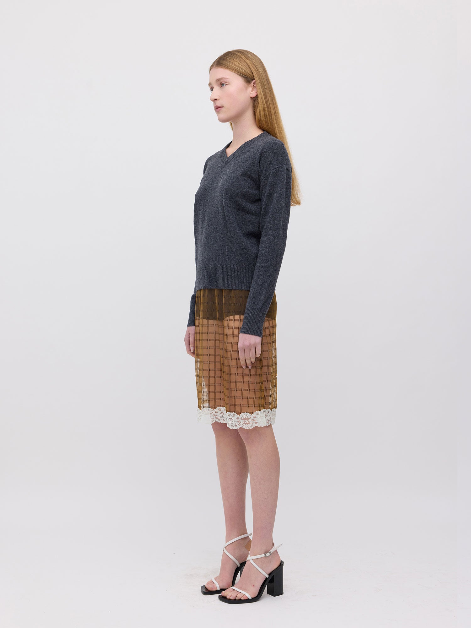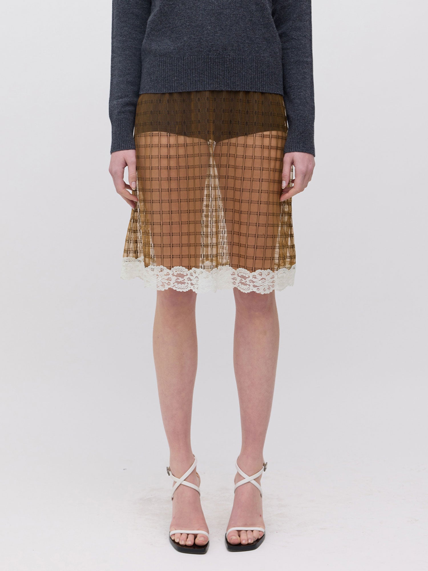 Midi length sheer brown check skirt with lace hem.Comes with liner skirt detachable via small snap domes.Invisible zip closure on side.100% PolyesterModel is wearing a size 8 and is 178cm tall