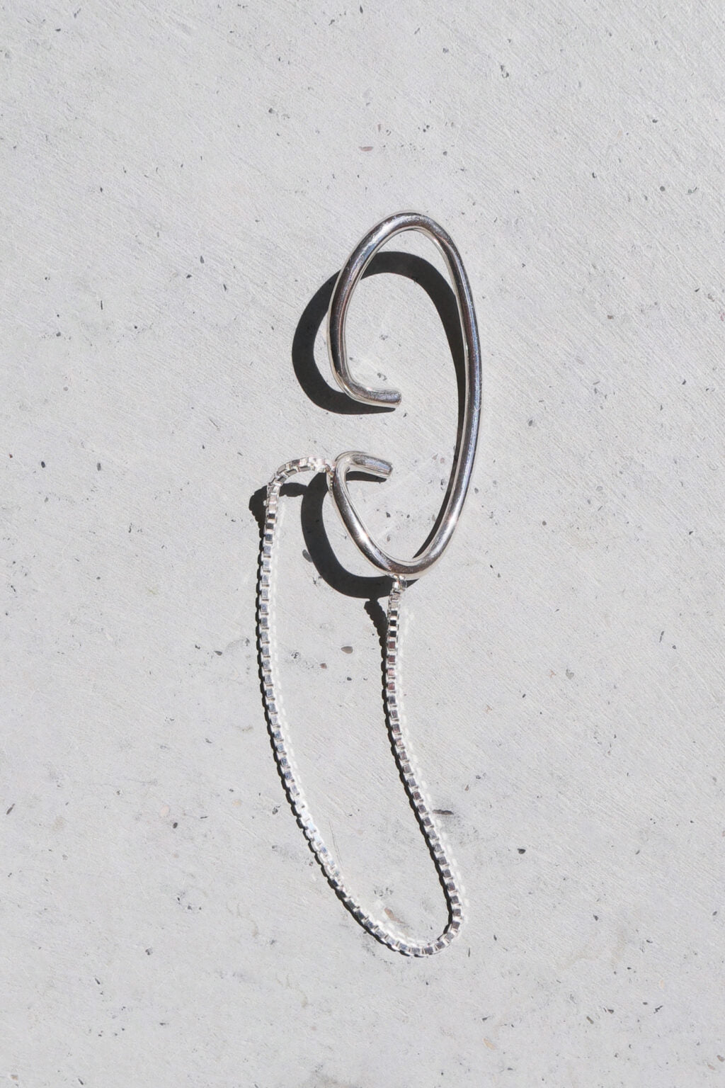 One earcuff that looks like two with a cubic chain falling like a loop earring. The center of the collection, the organic oval shape in this case got cut open and distorted. No piercing needed.