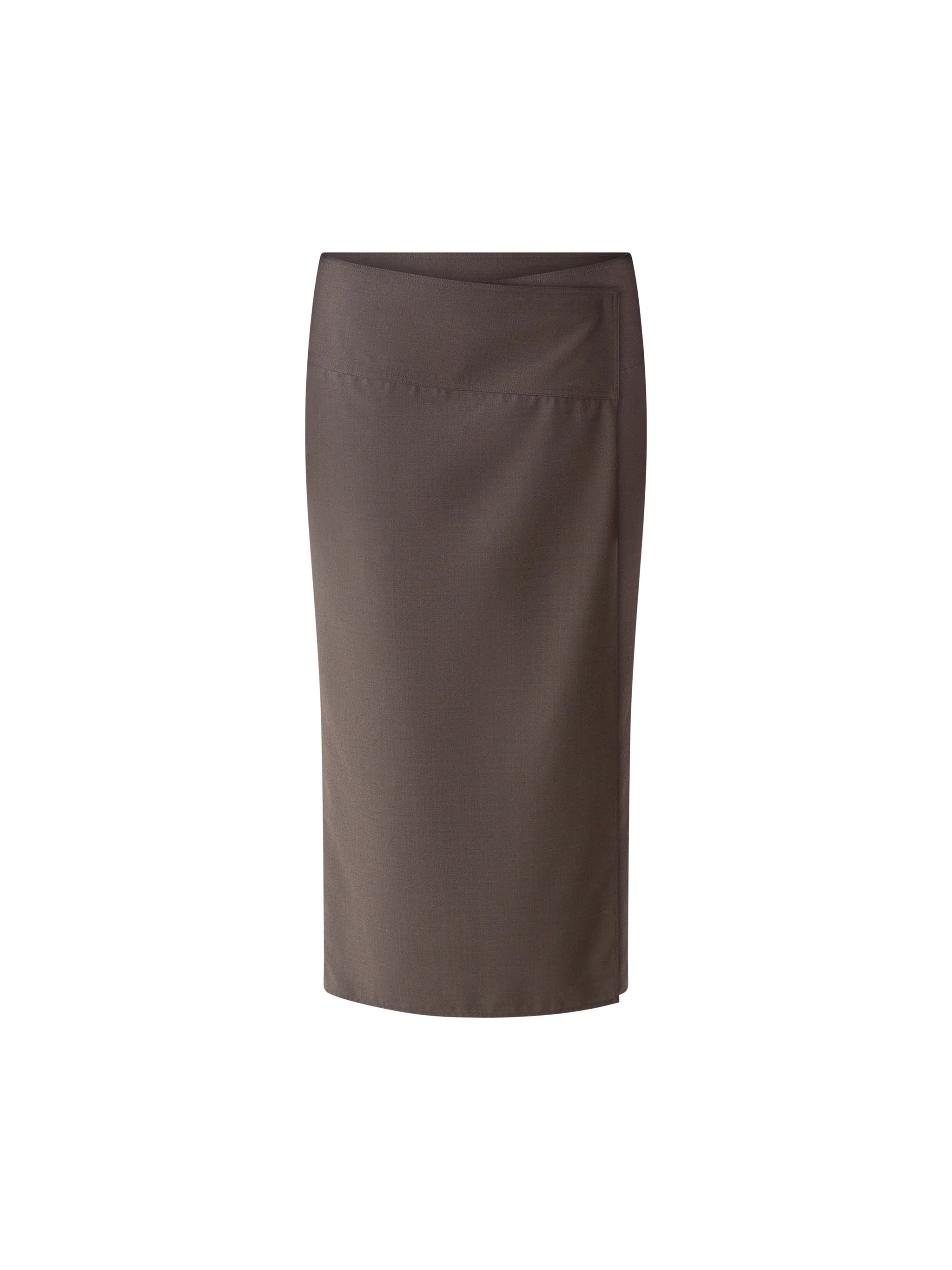 Midi skirt with asymmetrical fold-over waist, dual button wrap closure, and straight silhouette.