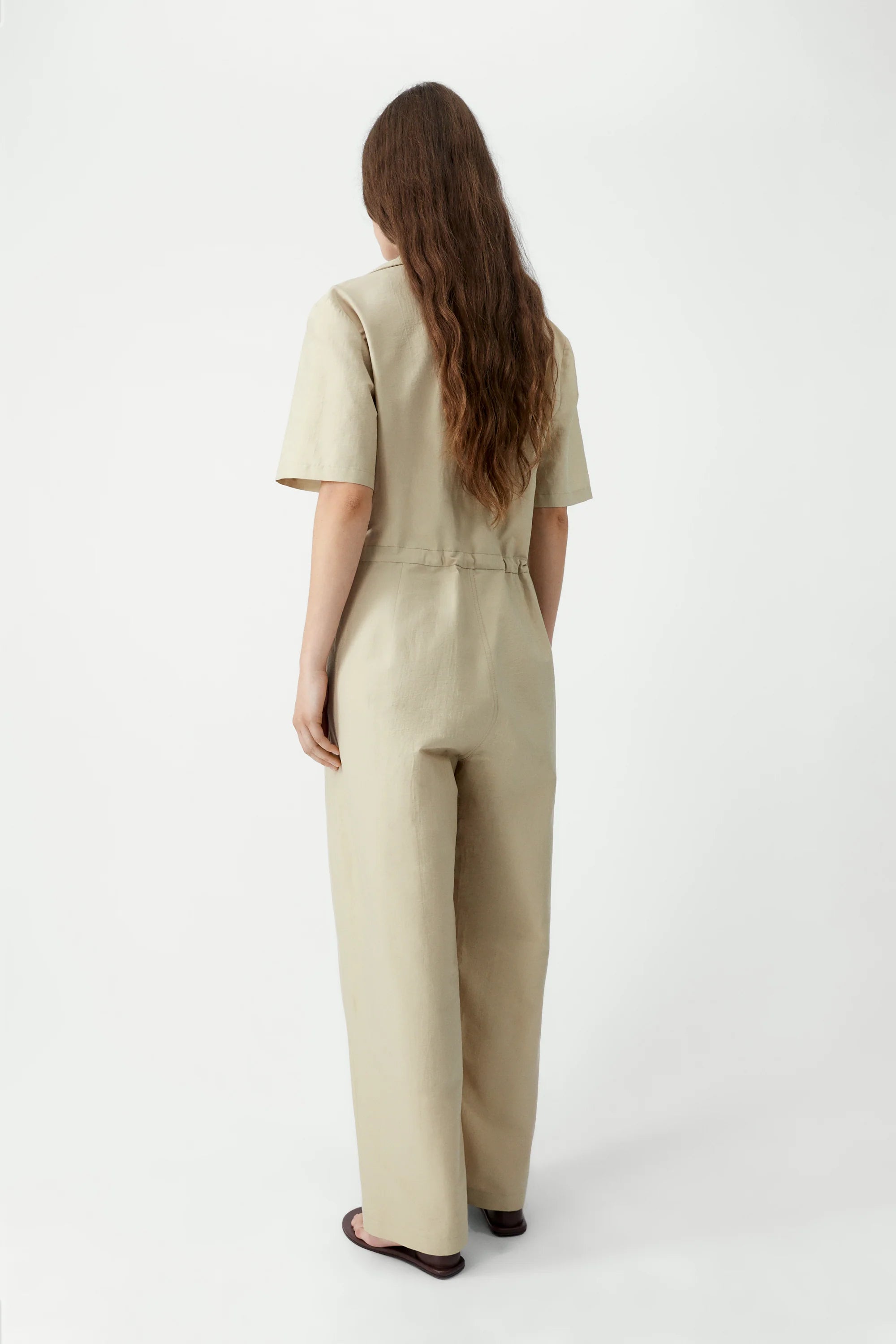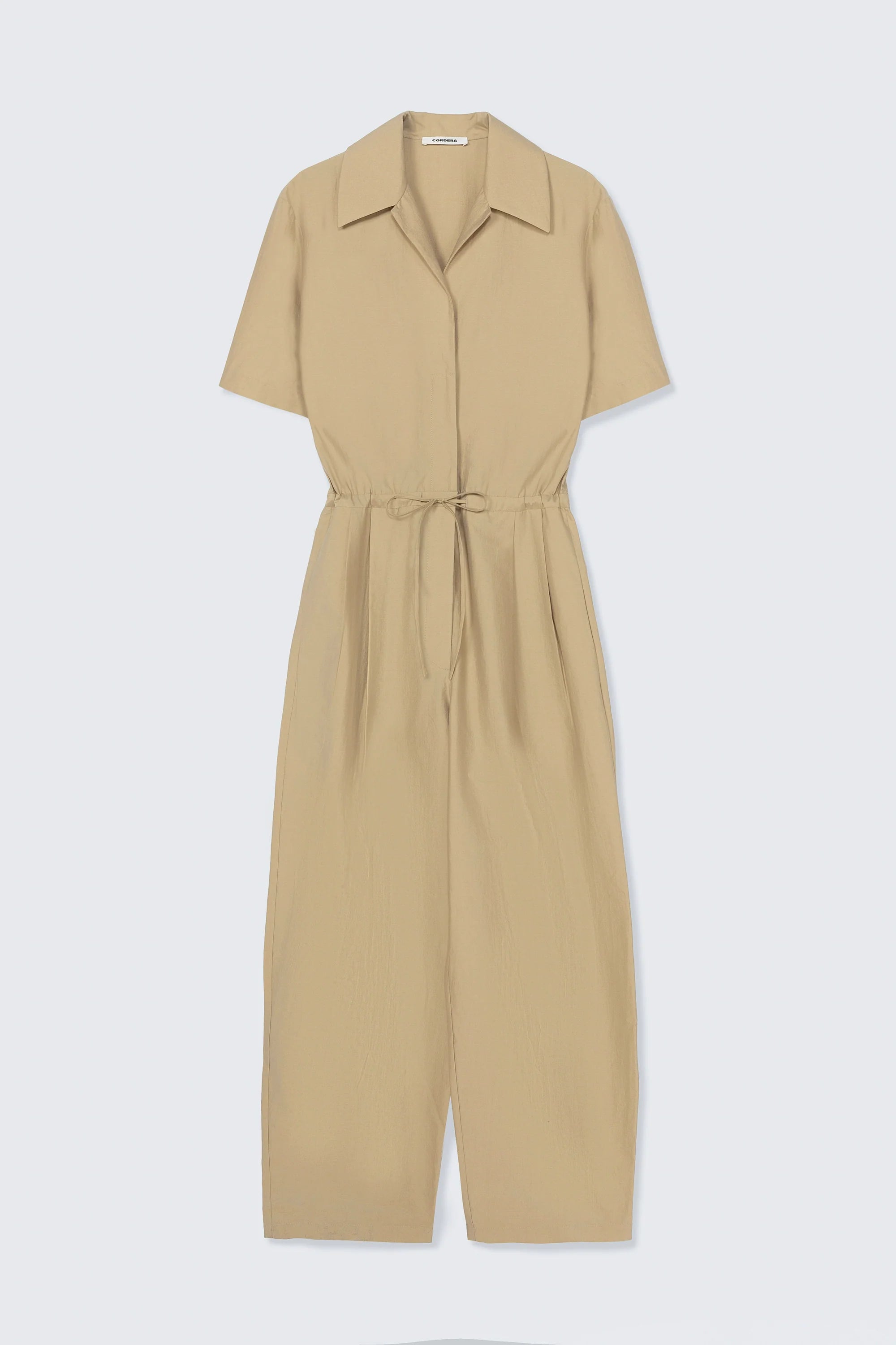 An oversized jumpsuit designed with an adjustable waist for a customizable fit, offering a relaxed yet refined silhouette. It fastens with a front zipper, while the upper part features a V-neckline with two buttons and the option to close it at the collar for a shirt-style finish. Short sleeves complete this versatile piece, blending ease and modern style.