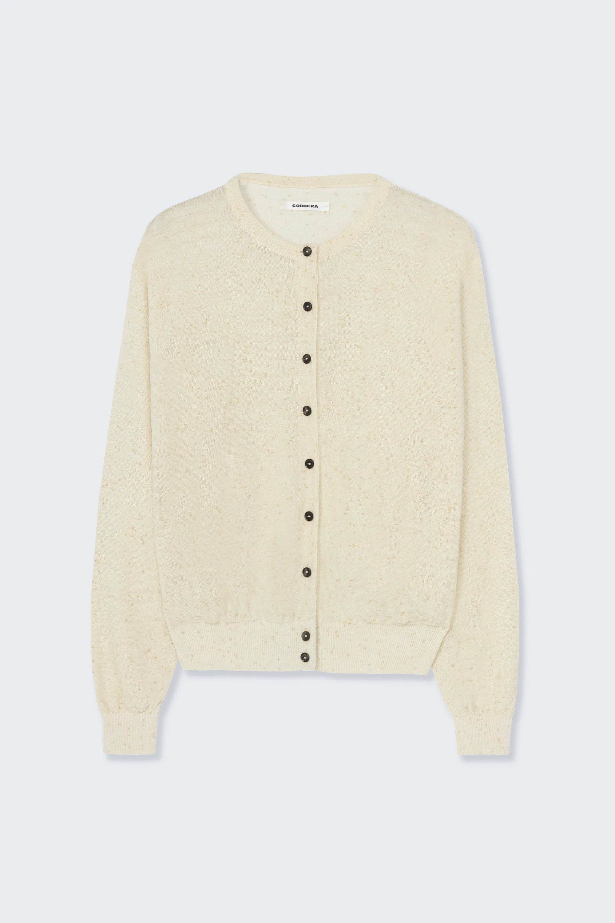 An oversized cardigan crafted from a linen and cotton blend for effortless comfort. Designed with a close crewneck and finished with ribbed trims at the collar, hem, and cuffs, it fastens with small front buttons in contrasr for a refined touch. In an eye-catching texture, this piece brings ease to everyday dressing.