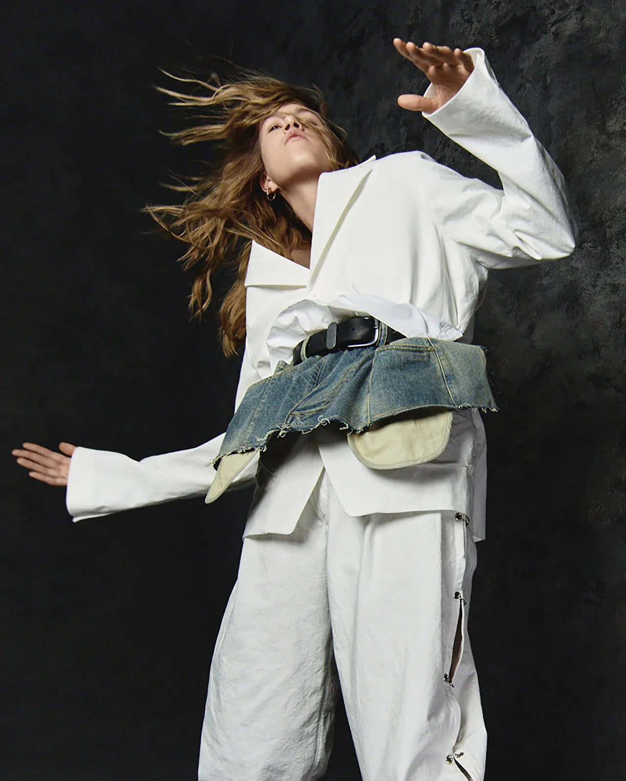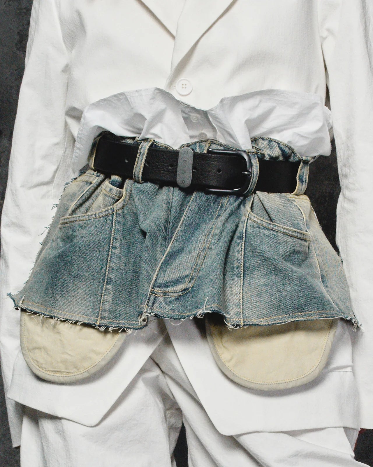 A waist accessory utilizing trompe l’oeil to mimic layered shirt and denim elements. Crafted from Japanese cotton and washed denim, the form functions as a sculptural tool to redefine the proportions of the silhouette.