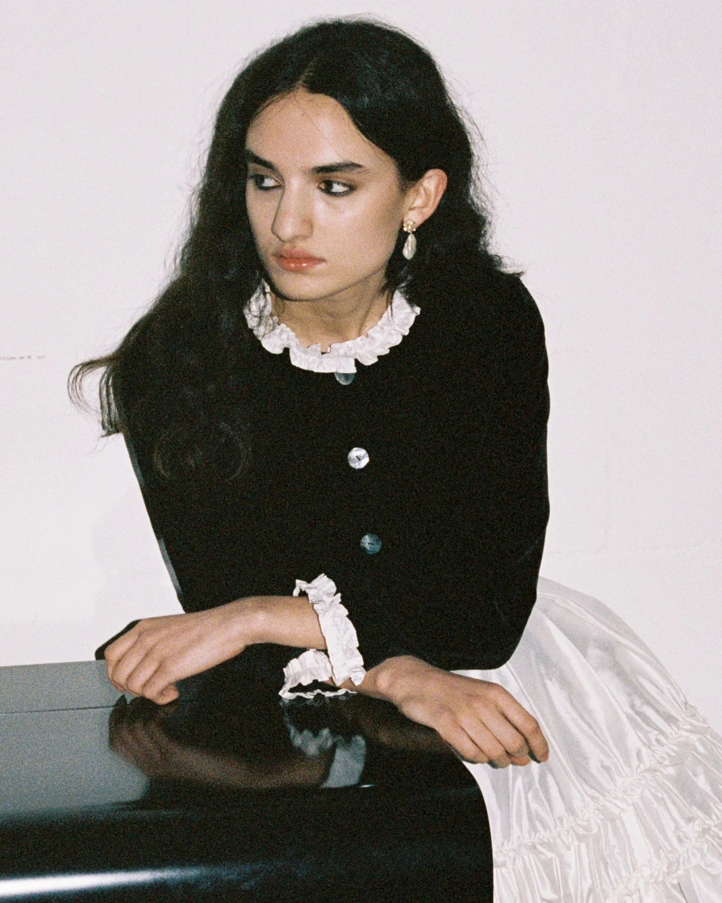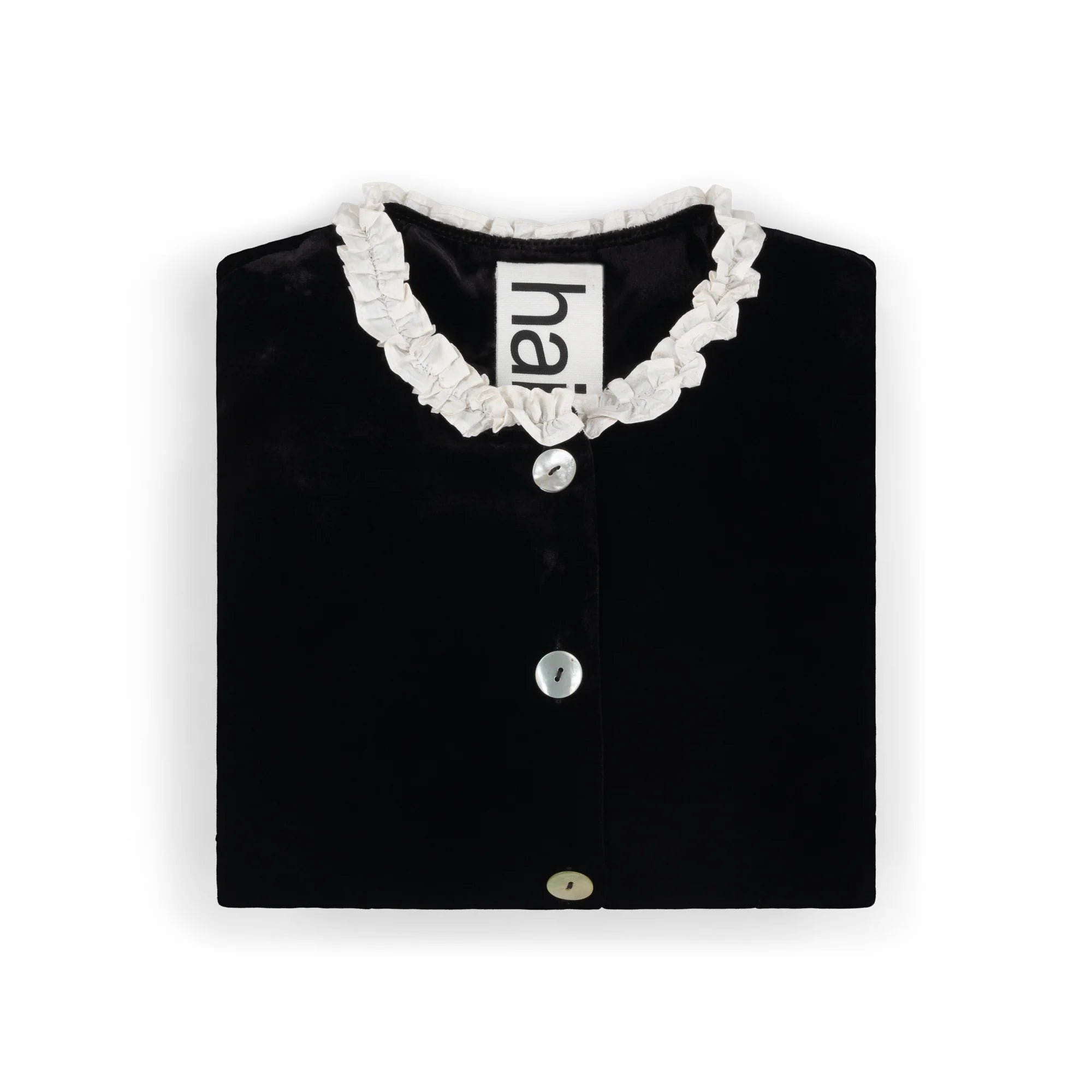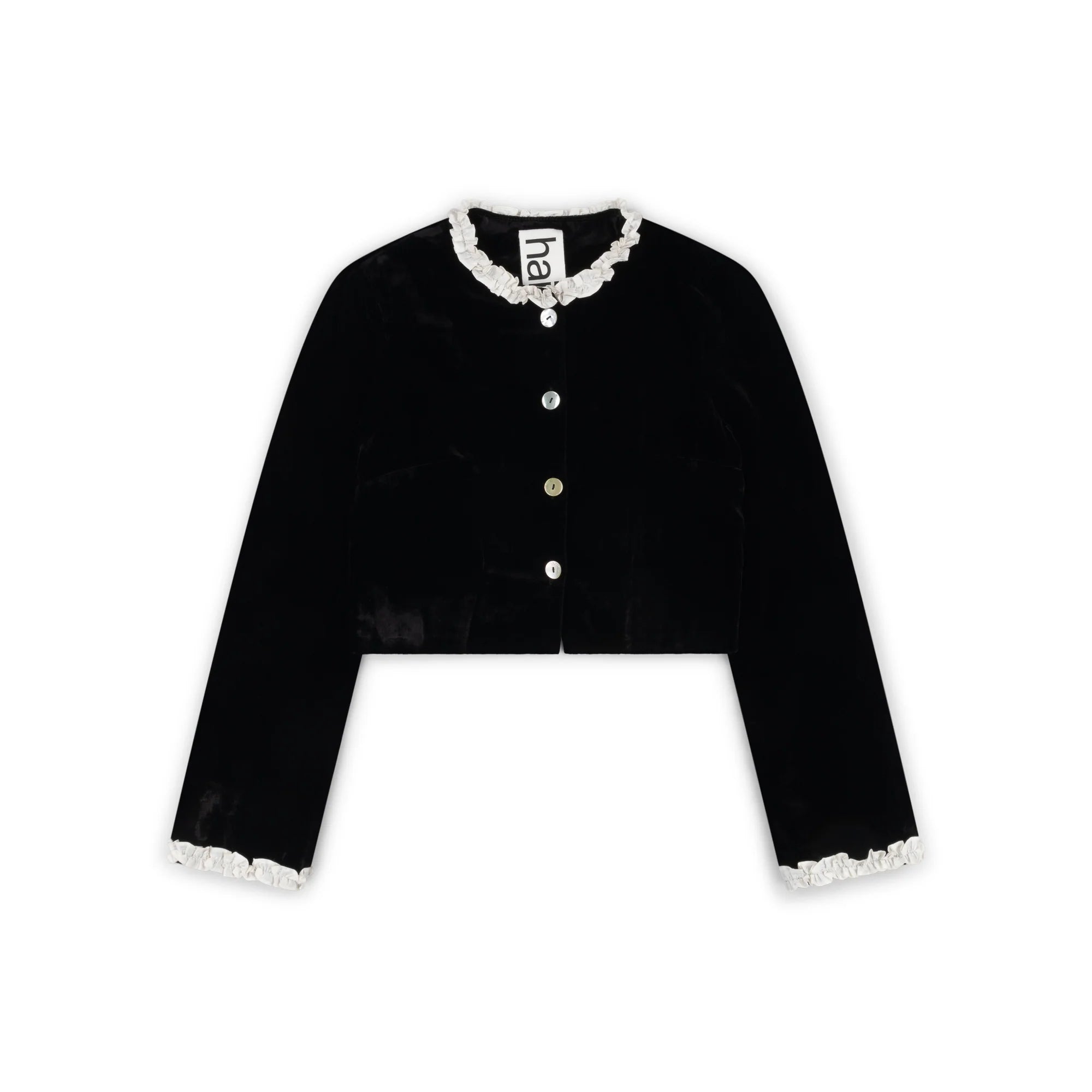 The Madeleine Jacket in Black and Ivory is fitted to a cropped length and is adorned with silk ruffles on the collar and cuffs. Complete with mother of pearl buttons.