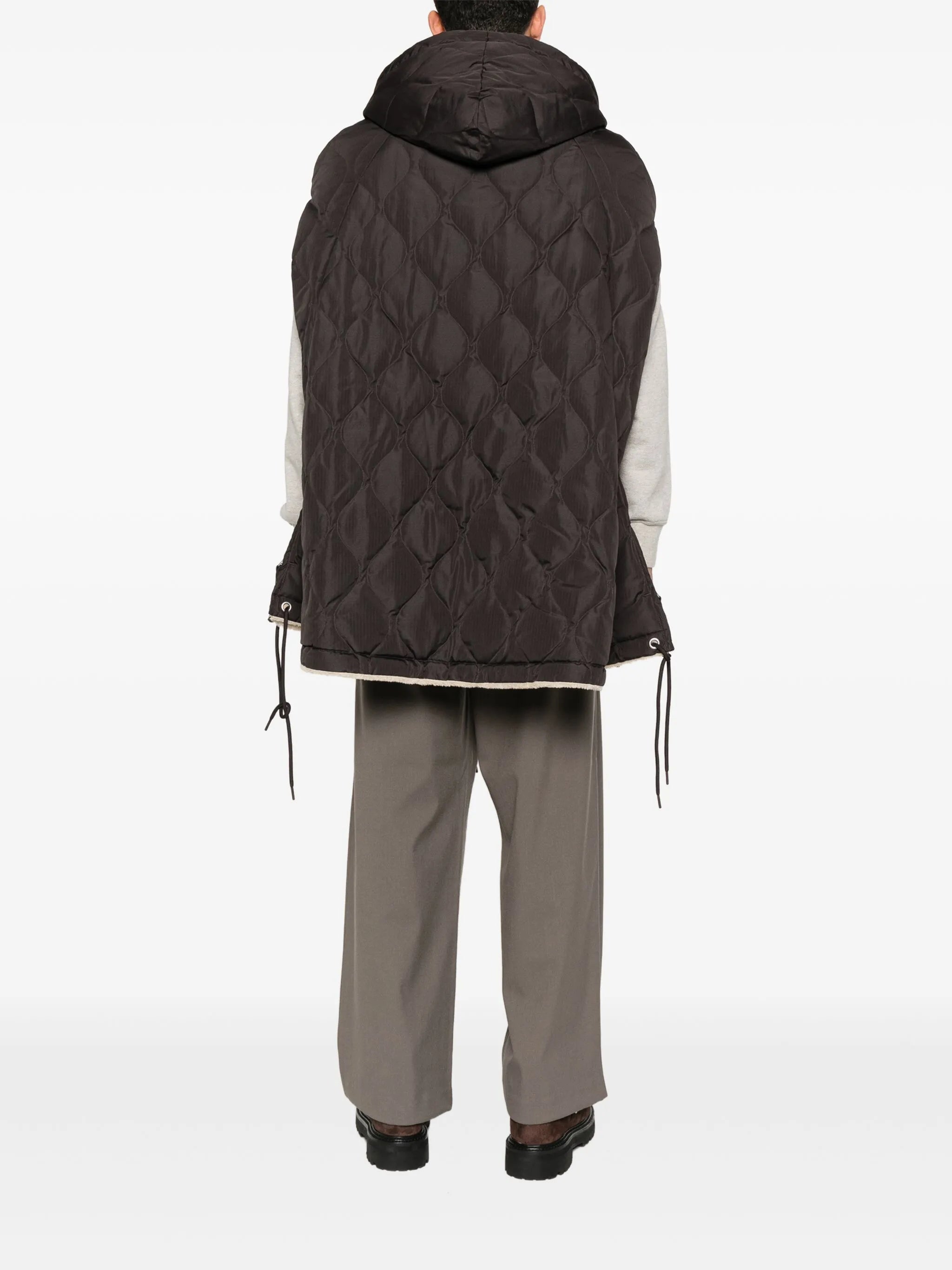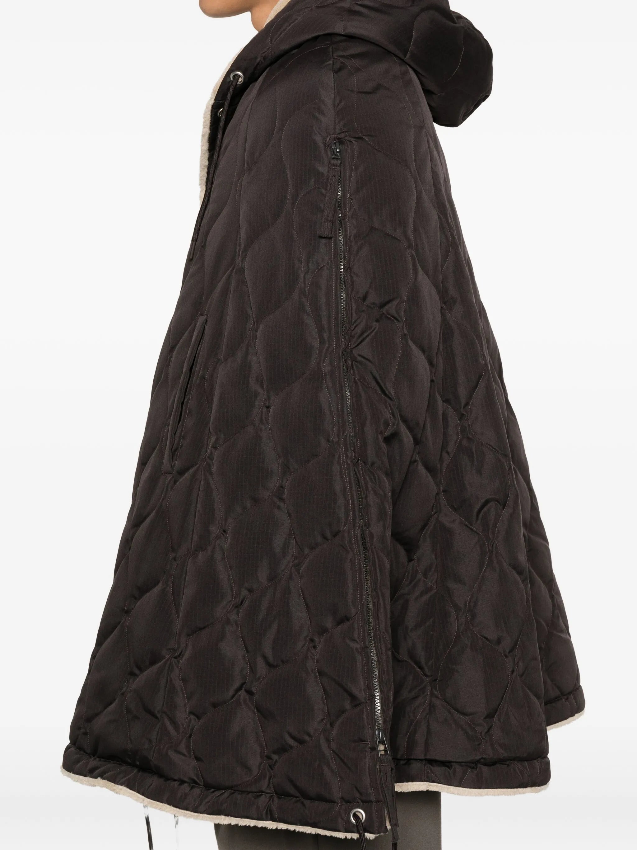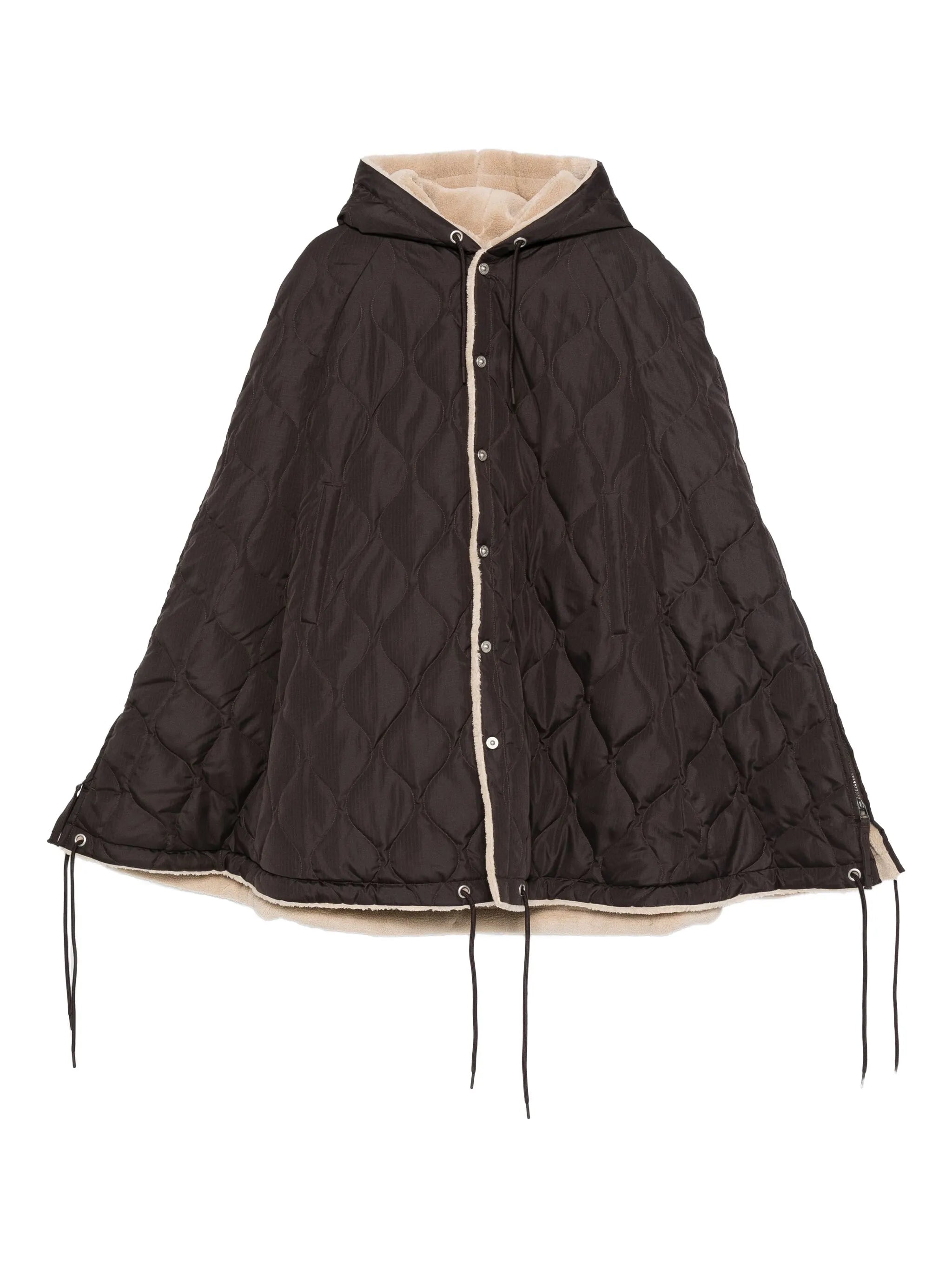 The military-inspired down poncho features a double-layered construction of down and boa, creating an attractive and voluminous silhouette. Unlike traditional pullover ponchos, it has a front opening for easy on and off. Designed to be worn over outerwear or backpacks, this statement piece boasts a generous fit and large front pockets. The product is designed unisex sizing. One-size-fits-all. Hand washable at home.